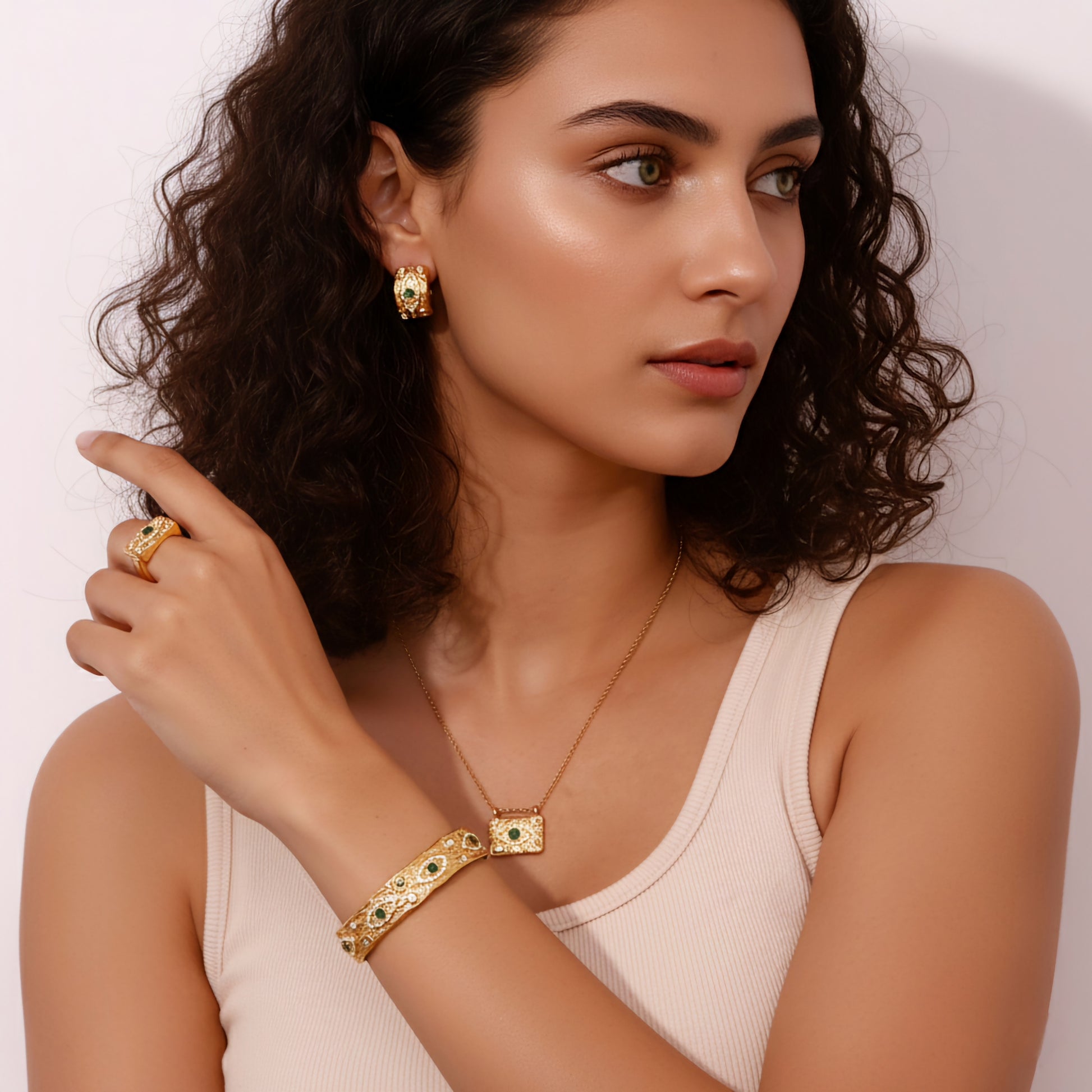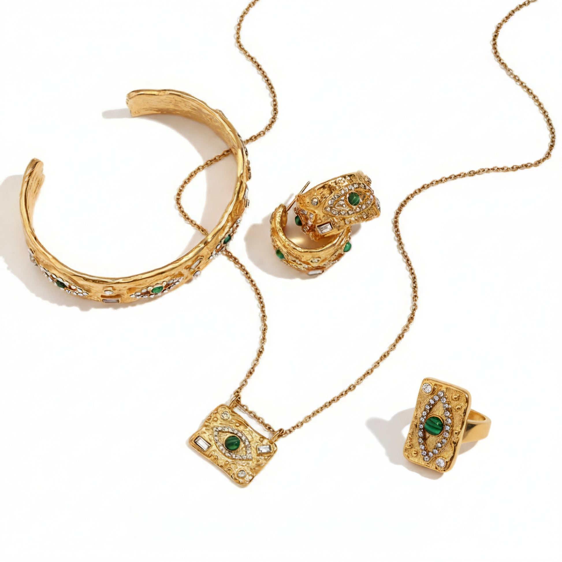 Introducing our Aegean Eye Set a radiant four piece collection crafted from premium titanium steel and designed to bring bold elegance to your everyday style. Each piece features luminous turquoise detailing paired with shimmering rhinestones, creating a captivating blend of texture, shine and symbolic beauty.