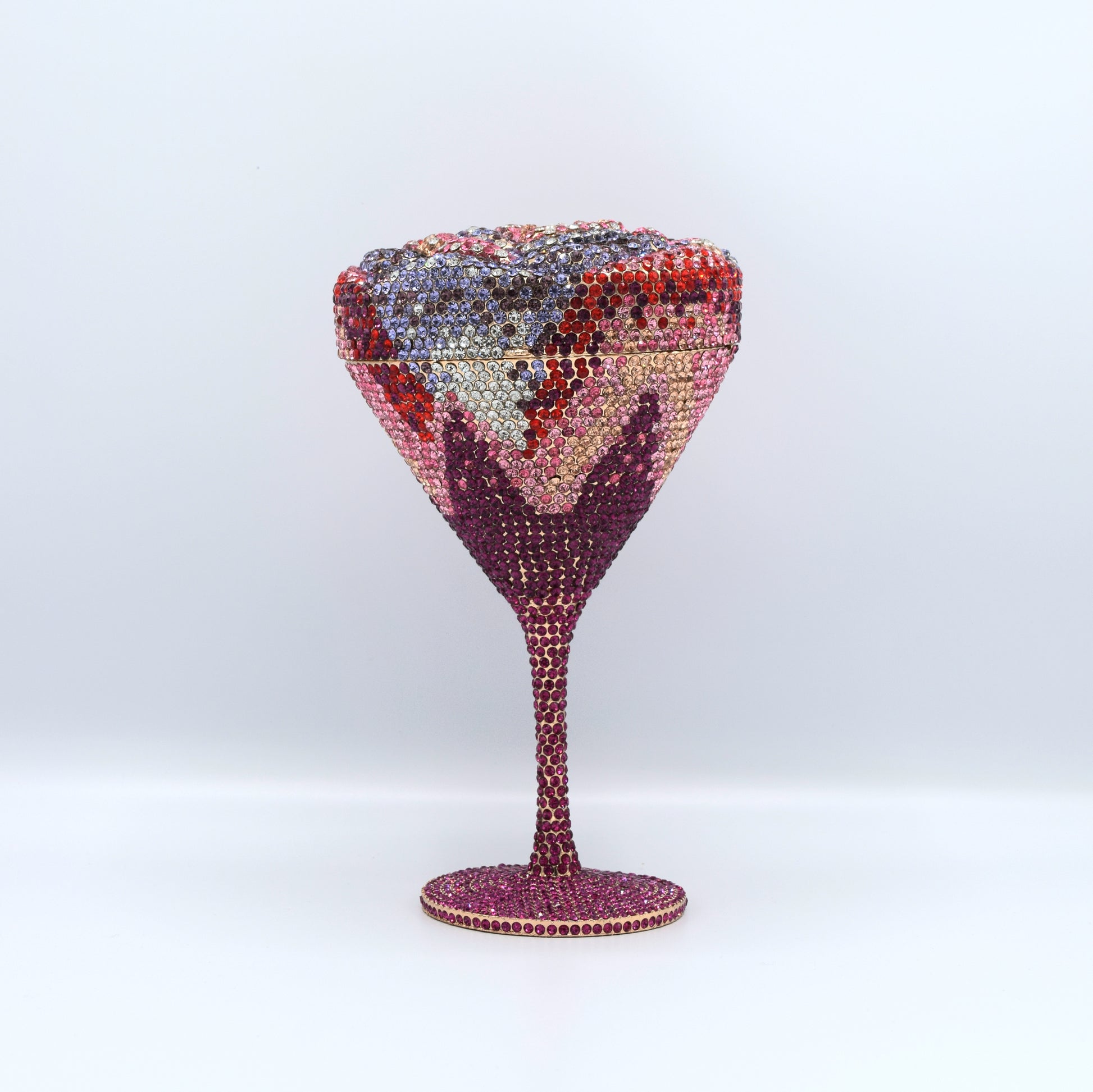 The After Party Clutch is pure nightlife glamour captured in sculptural form. Designed as a crystal martini glass and fully encrusted with shimmering rhinestones this piece celebrates late nights bold looks and unforgettable entrances. Its faceted sparkle and elegant stem silhouette turn a party icon into a high fashion statement that feels playful polished and undeniably chic.