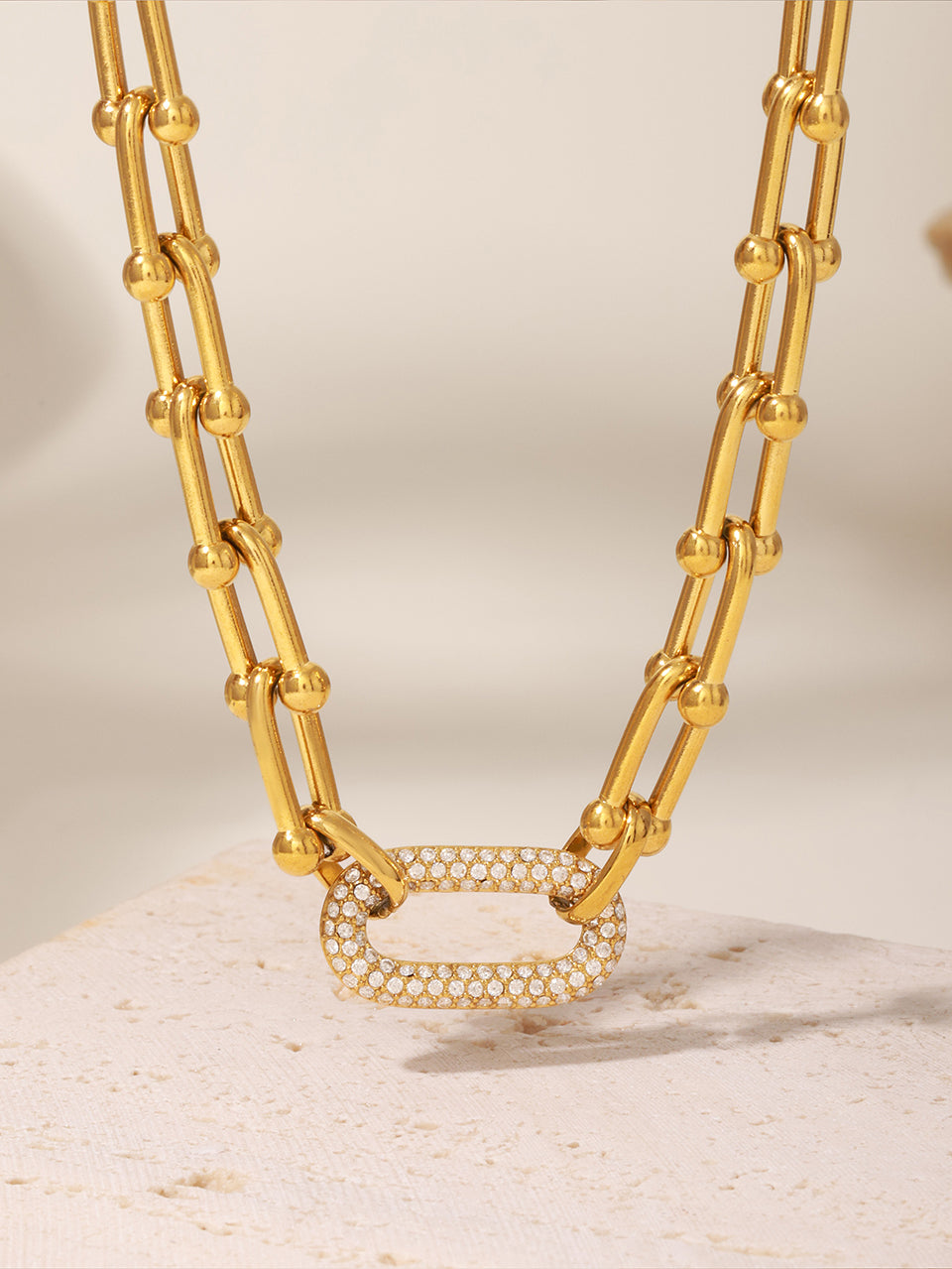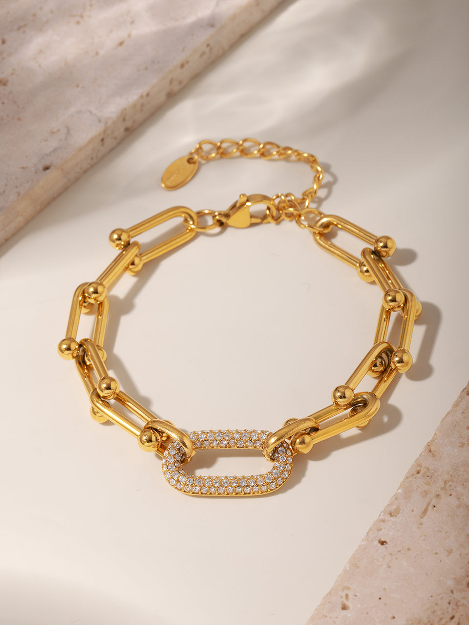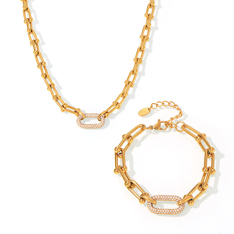 A refined blend of bold design and timeless luminosity. Crafted from premium stainless steel and finished with radiant 18k gold plating, this elegant set features a striking necklace and matching bracelet connected by a zircon encrusted link that adds a soft, sparkling touch to the modern silhouette.