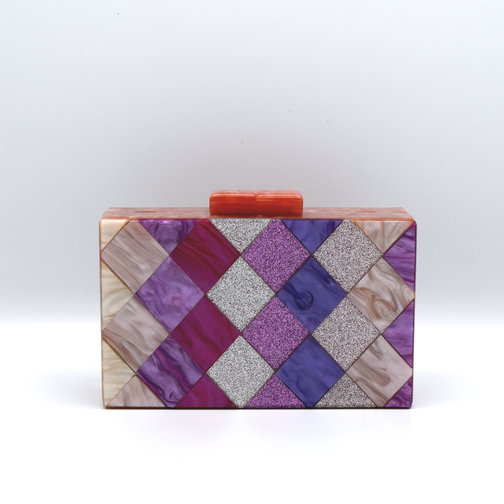 Hand-crafted with alternating tiles of lilac, fuchsia, silver glitter, and pearl white, it’s designed to shimmer under every light, from rooftop nights to wedding spotlights.
