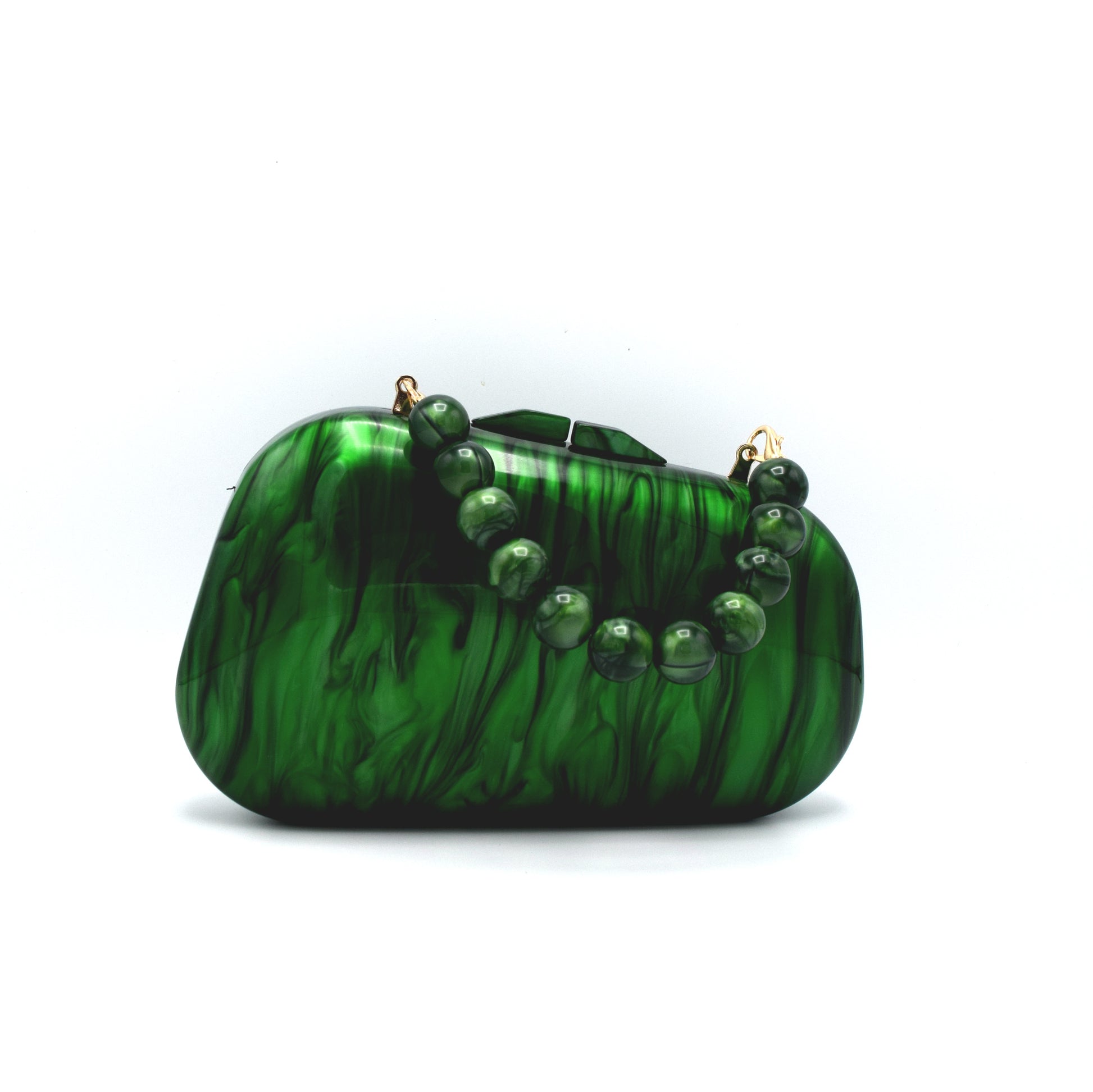The Émera Clutch embodies refined power and timeless allure, a deep green masterpiece crafted from premium marbled acrylic that glows like polished emerald stone. Designed with a smooth rounded silhouette and a beaded handle, it merges sophistication with contemporary flair. Perfect for evening wear, weddings, and statement moments, Émera is the ultimate luxury green acrylic bag for women who love bold elegance.