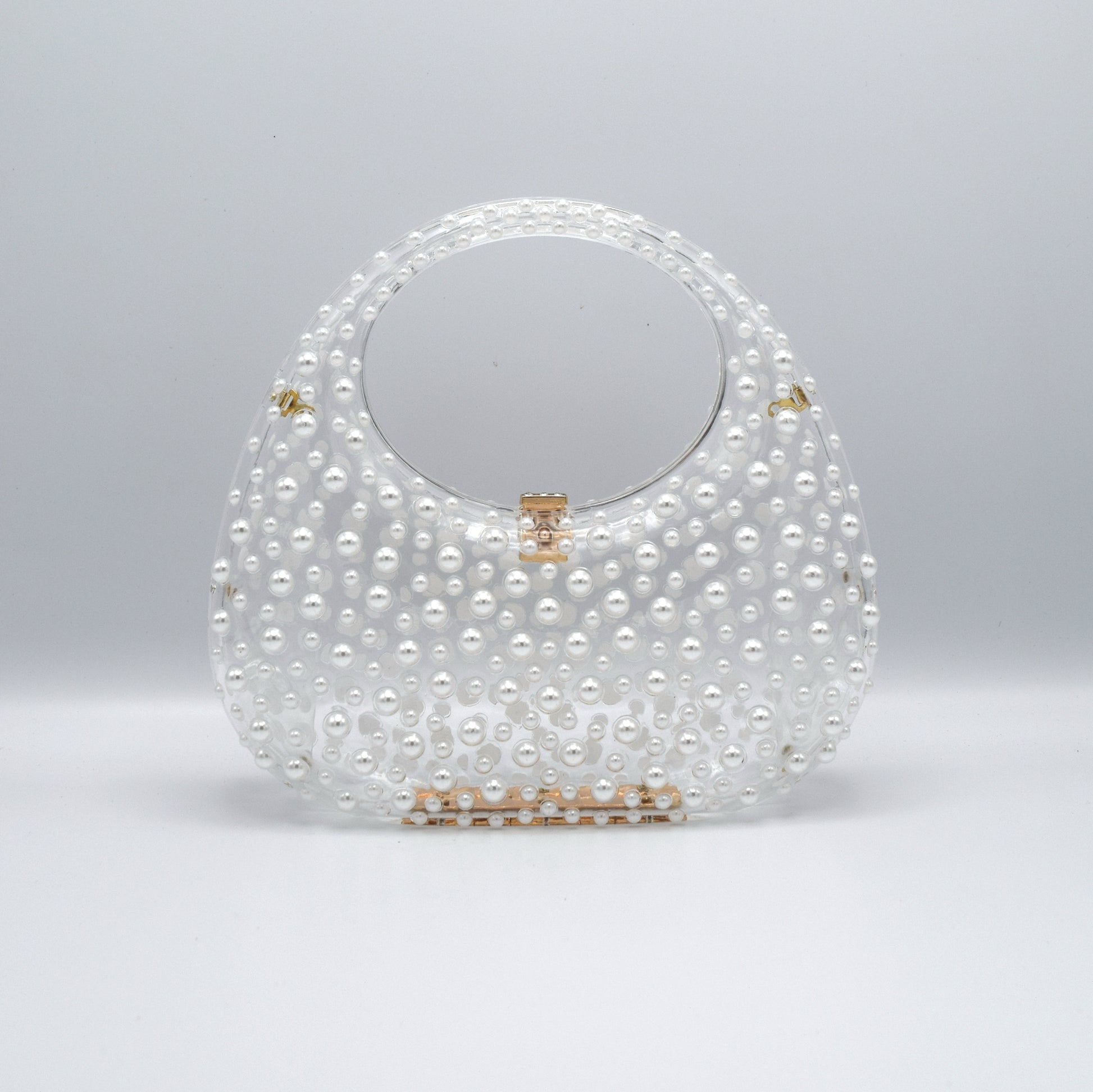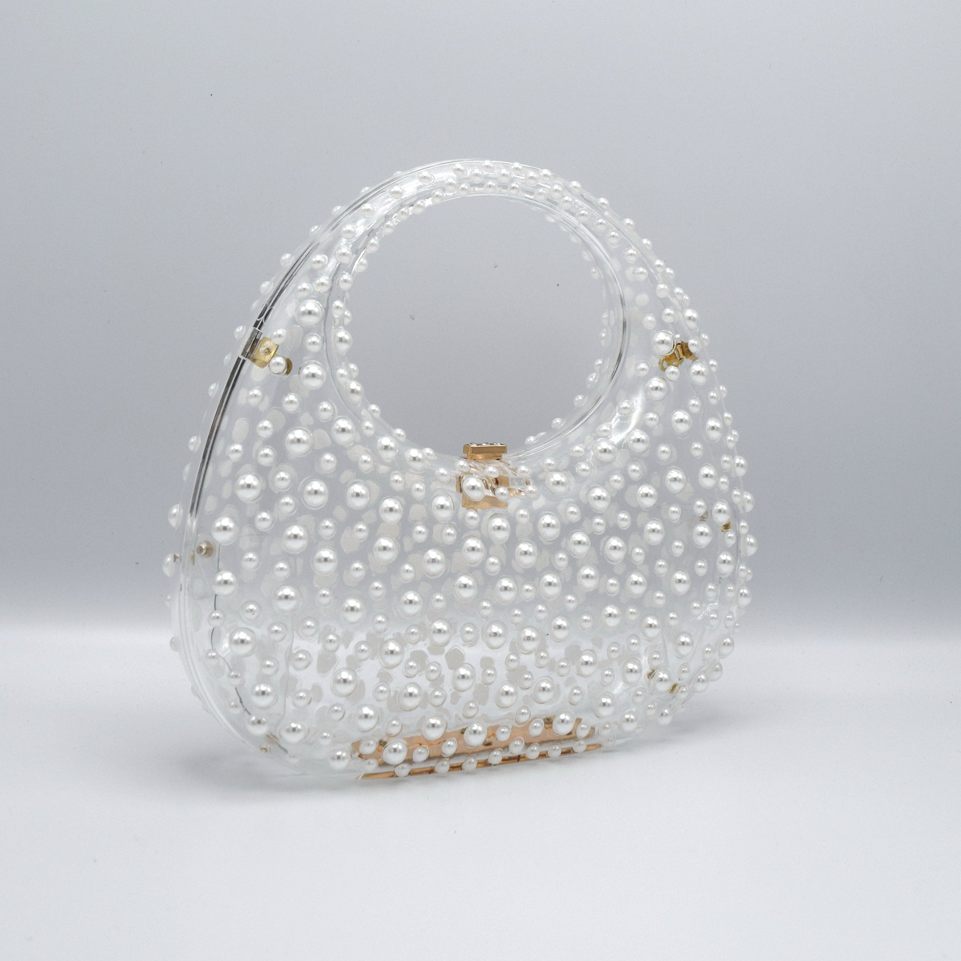 The Éternelle Clutch is the embodiment of timeless elegance, a luminous piece adorned with delicate pearl detailing that exudes grace and sophistication. Designed with a sculptural crescent silhouette and crafted from premium transparent acrylic, this pearl-embellished evening bag is a modern heirloom made for life’s most special moments.