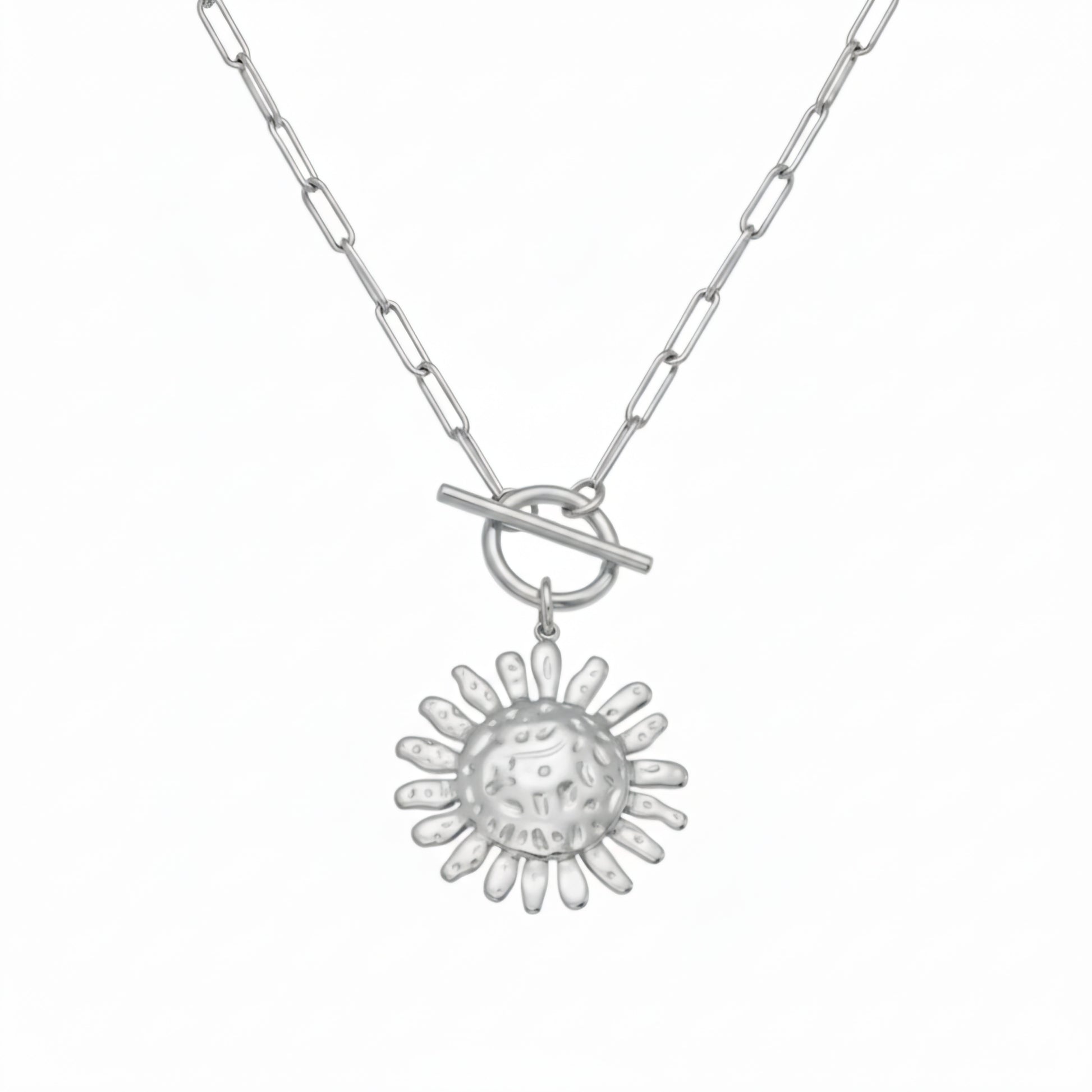 Introducing the Helios Necklace a radiant symbol of warmth, light, and effortless elegance. Crafted from premium stainless steel, this striking piece features a textured sun pendant measuring 3.1cm in height and 2.8cm in width, suspended from a refined paperclip chain for a modern elevated look.