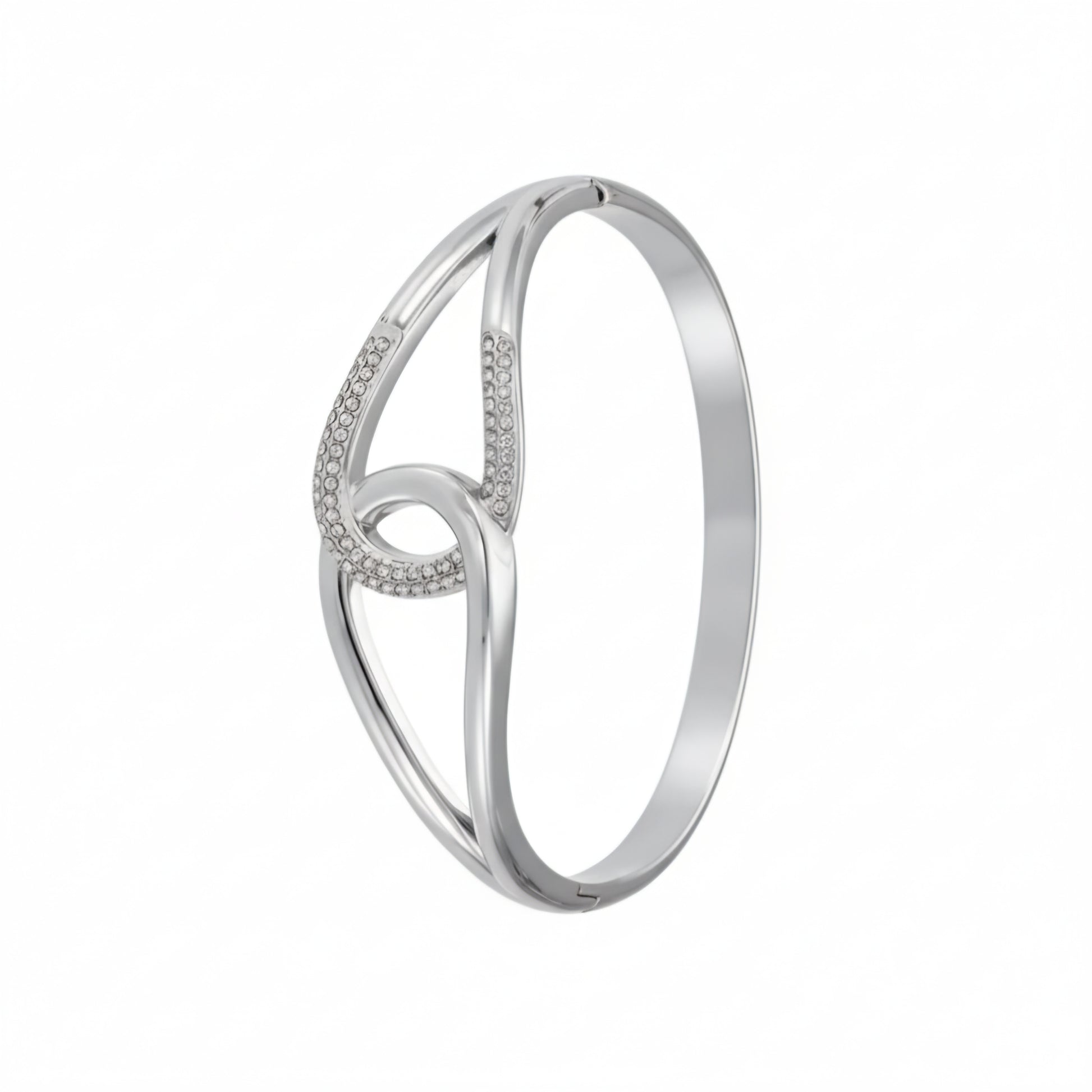 Introducing our Infinity Loop Bracelet a sculptural stainless steel piece designed with a fluid looping silhouette that symbolizes continuity elegance and effortless modern style. Finished with a shimmering zircon pave detail it brings a refined touch that catches the light from every angle.
