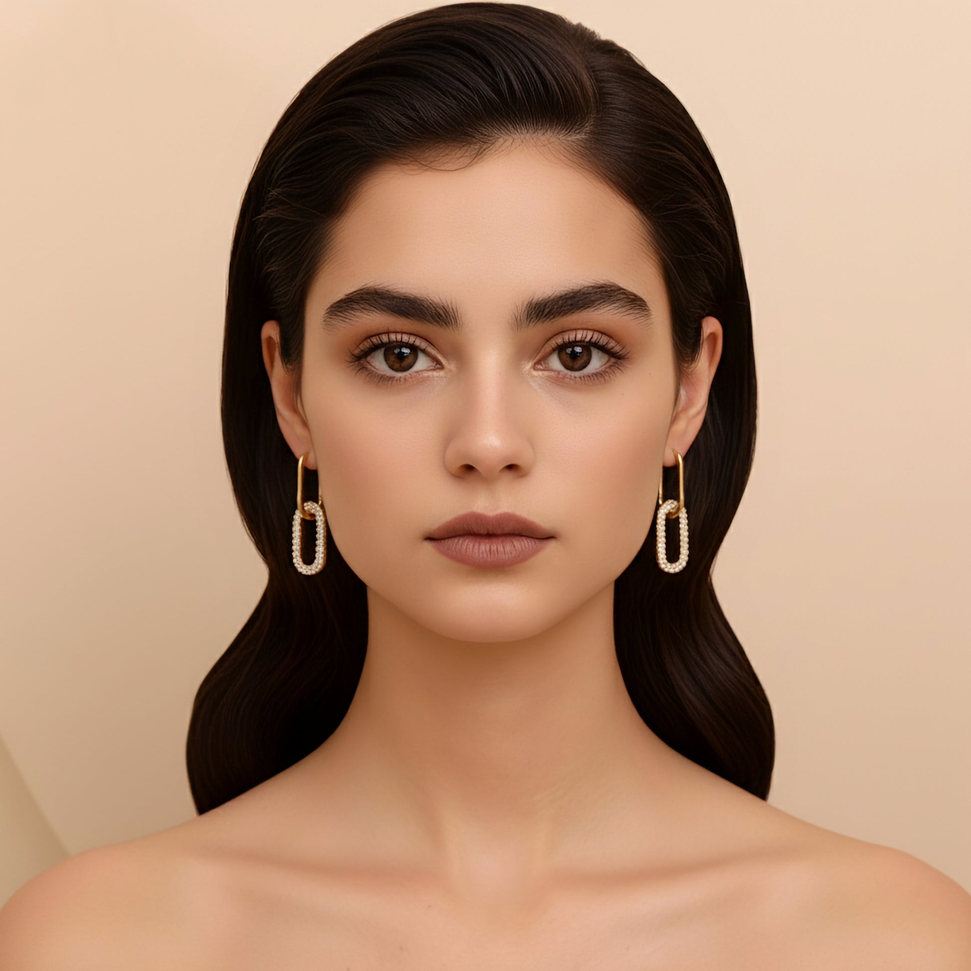 A sophisticated blend of sparkle and modern design. Crafted from premium 316L stainless steel and finished with rich 18k gold plating or sleek polished silver, the Mariel Earrings feature an elongated pavé link suspended from a smooth rectangular hoop. Their refined silhouette highlights a luxurious cascade of zircon stones that shimmer with every movement.