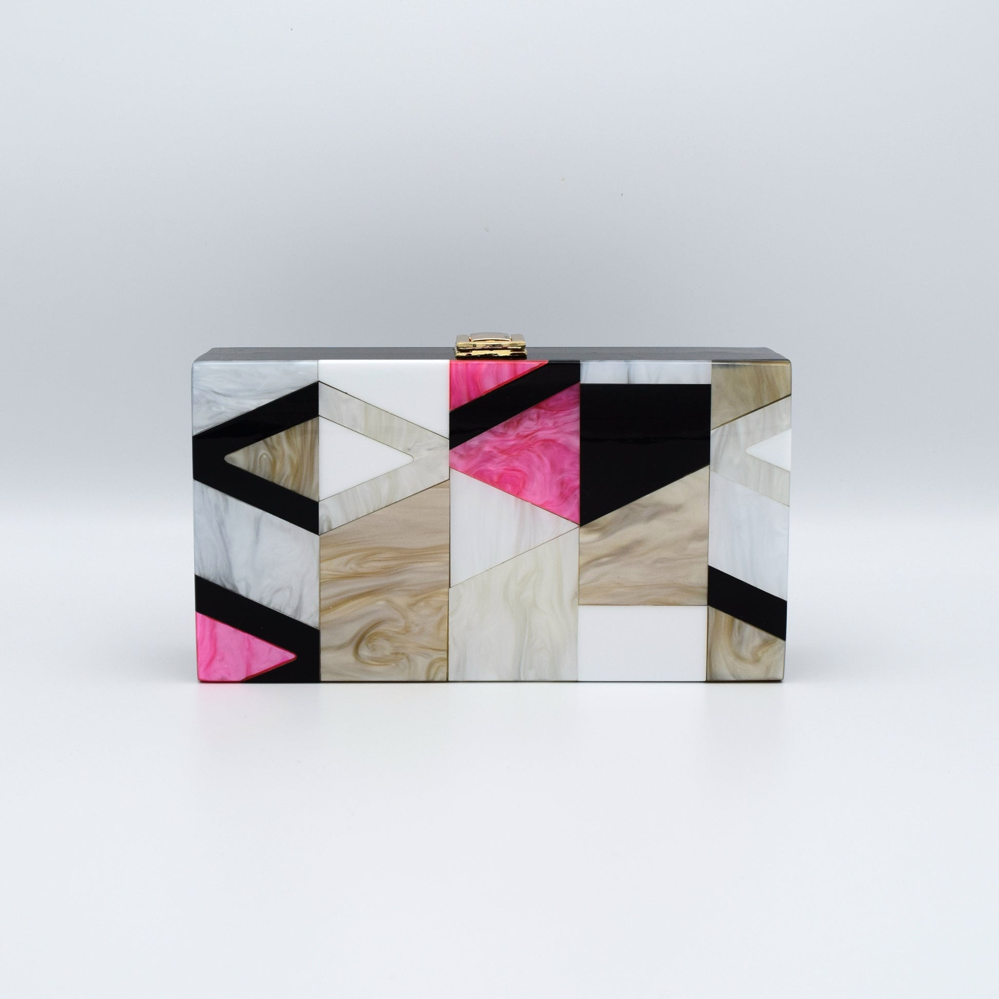 Museo is a wearable work of art. With its intricate mosaic of pink, ivory, black, and caramel-toned acrylics, this clutch brings bold geometry to life in a sleek rectangular frame. Its modern, architectural design nods to contemporary art and urban chic, making it the perfect plus-one for gallery nights, fashion events, and standout evenings. Colorful yet refined, Museo is a statement piece for the bold and the beautifully dressed.
