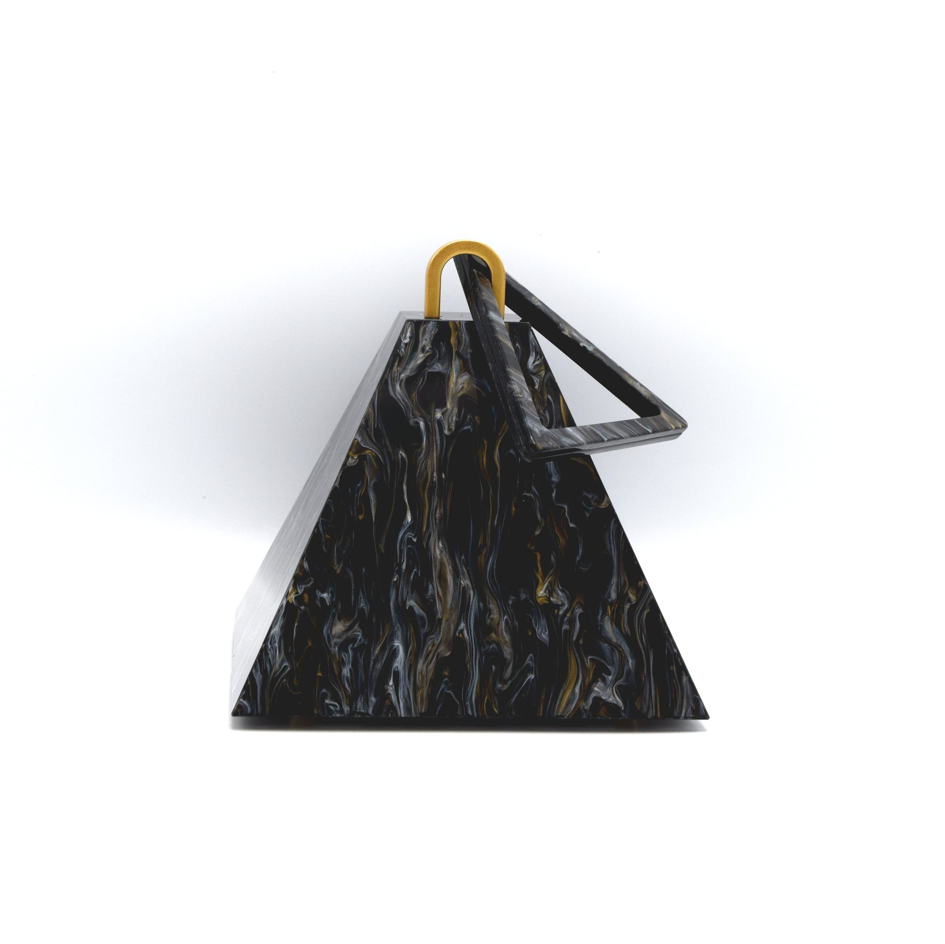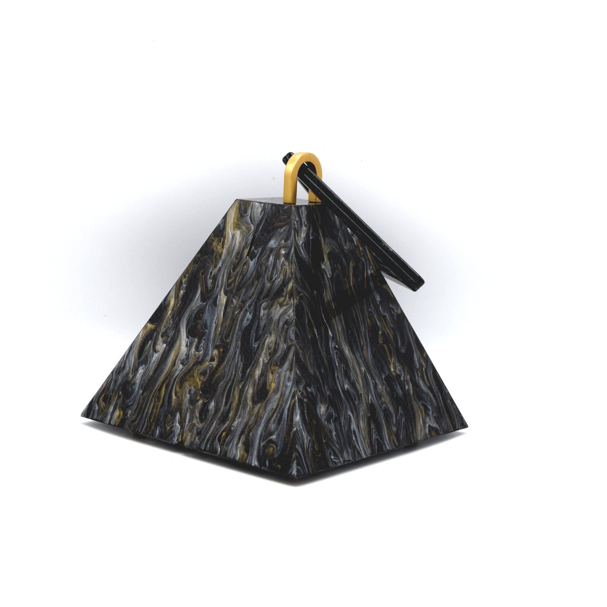 The Nefra Clutch is a bold fusion of geometry and glamour, an architectural masterpiece that redefines statement accessories. Sculpted in a distinctive pyramid silhouette and crafted from marbled black and grey acrylic, this bag captures light and texture from every angle. Designed for women who dare to stand out, Nefra is the ultimate sculptural acrylic handbag for evening wear and artful occasions.