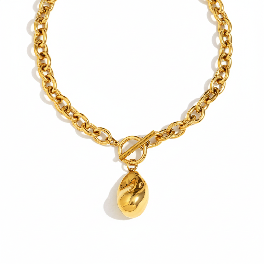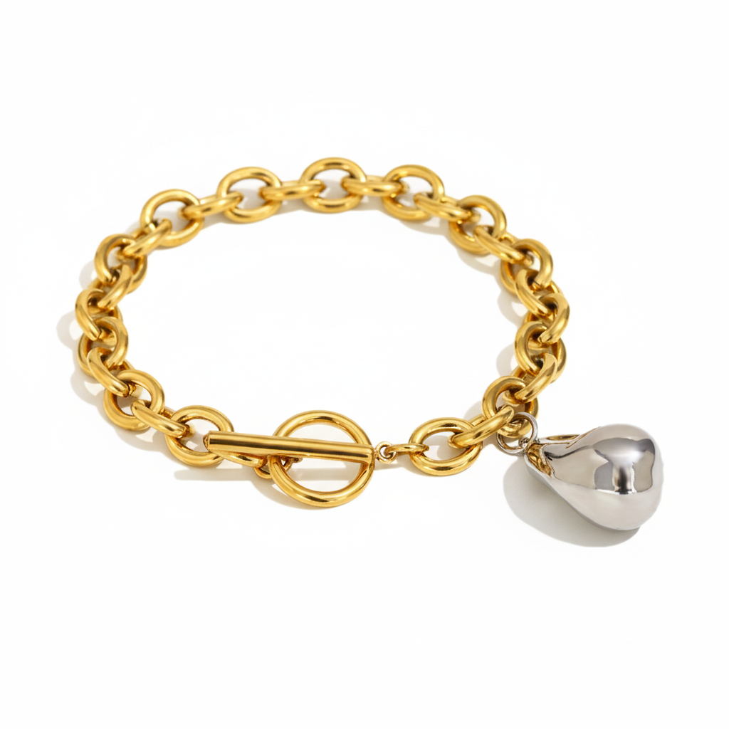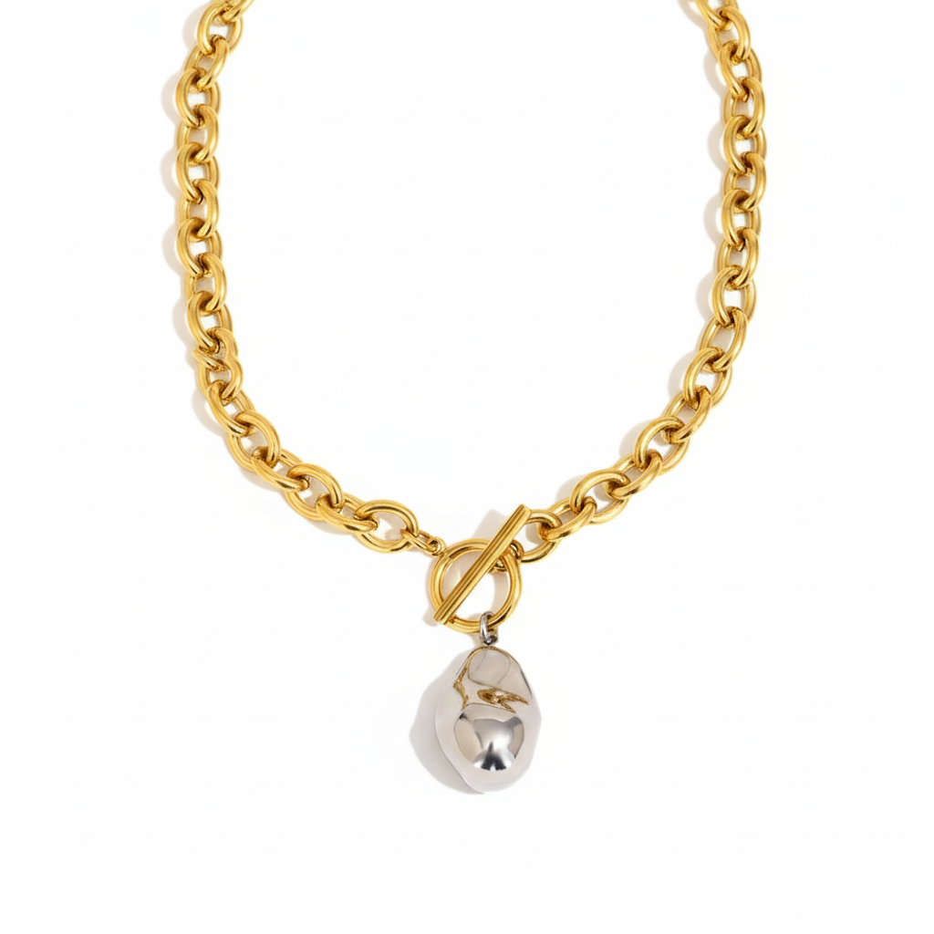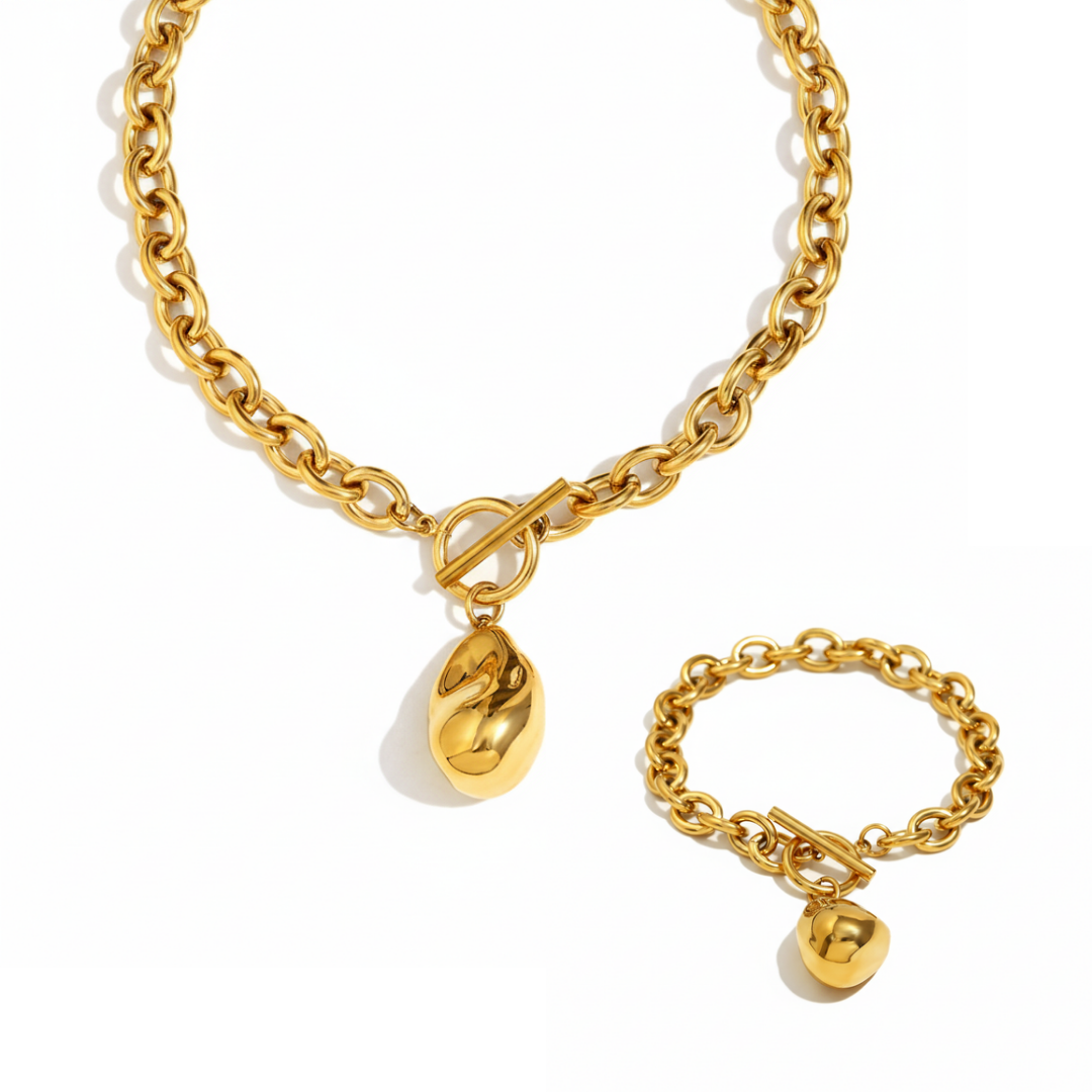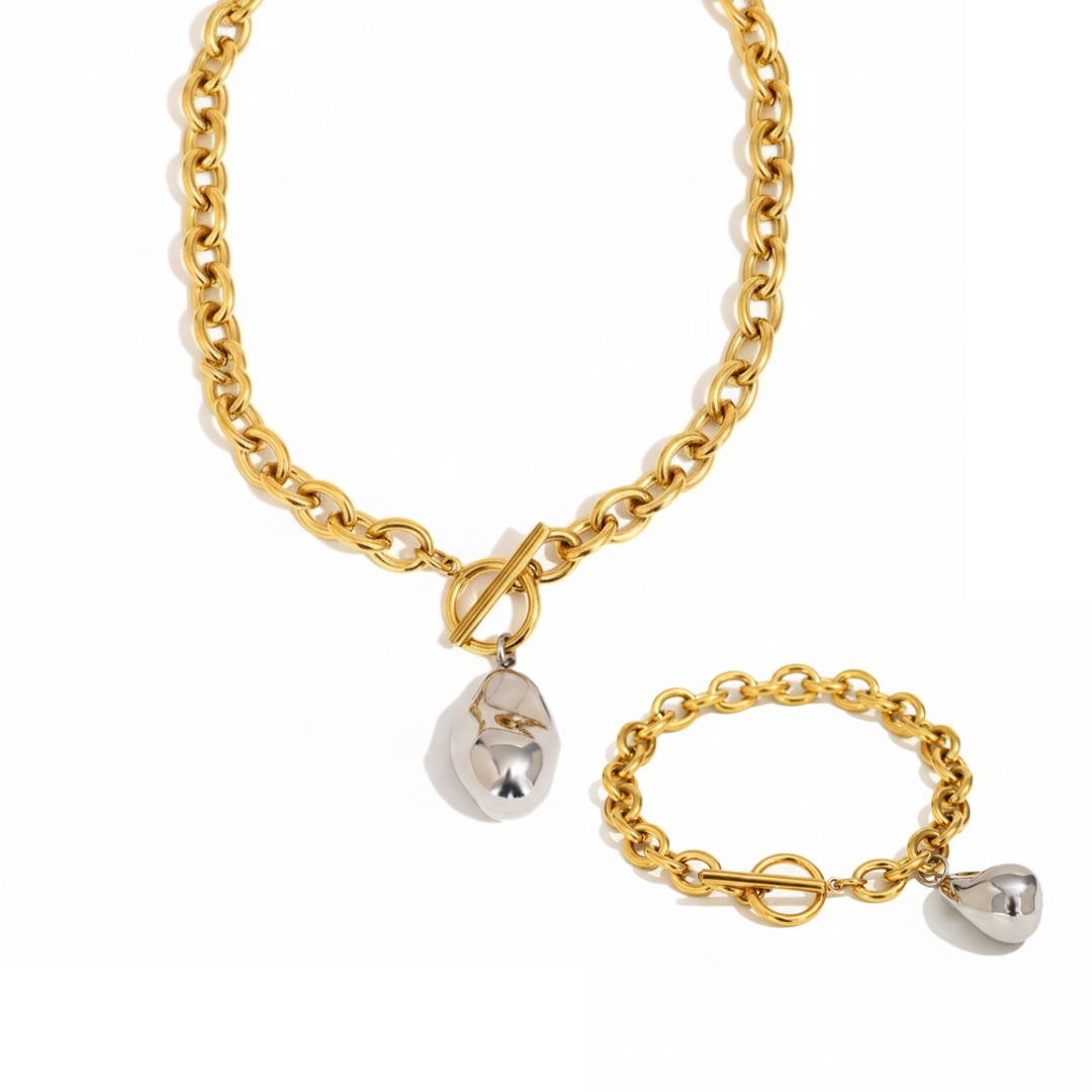 A refined blend of modern elegance and sculptural charm. Crafted from premium 316L stainless steel and finished with radiant 18k gold plating, the Oravine Set features a matching bracelet and necklace adorned with a smooth organic droplet pendant. The two tone design adds a contemporary touch, pairing golden links with a molten silver inspired pendant for a look that feels both bold and timeless.