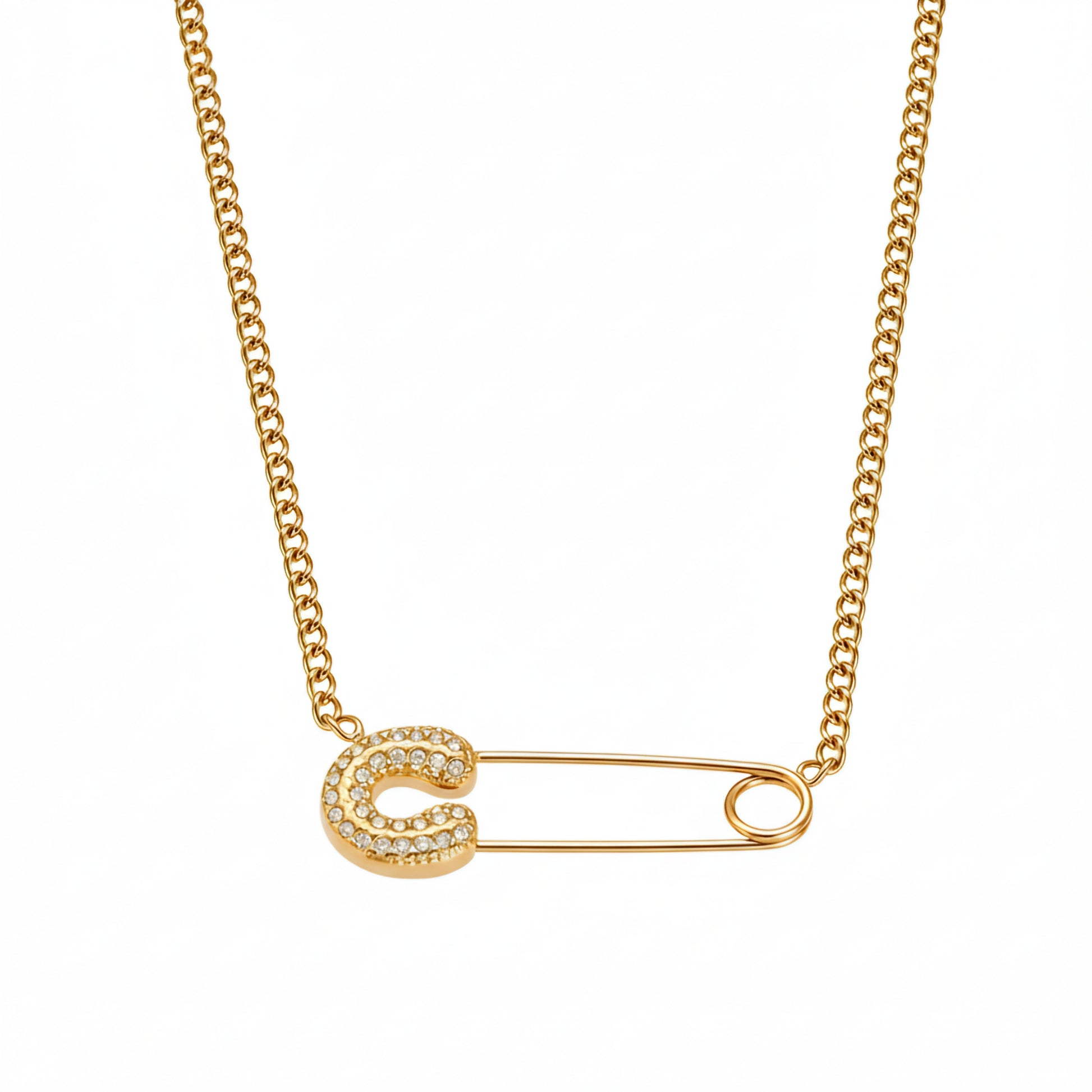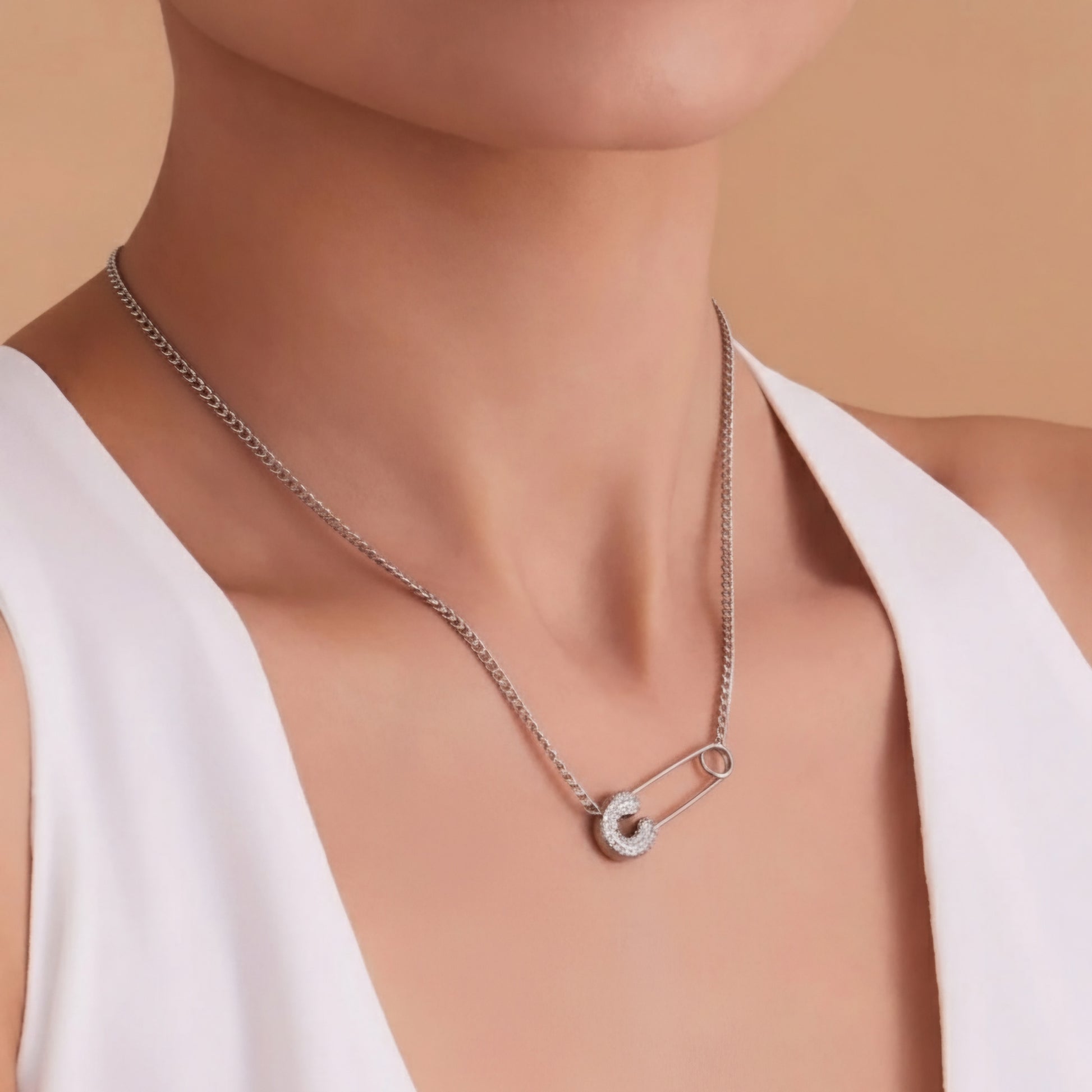 Introducing our Pave Pin Necklace a bold and modern statement piece crafted to bring an edgy sparkle to any look. Designed from premium stainless steel and adorned with brilliant zircon stones, the pendant features a chic safety pin silhouette set with a shimmering pave C shape that catches the light from every angle.