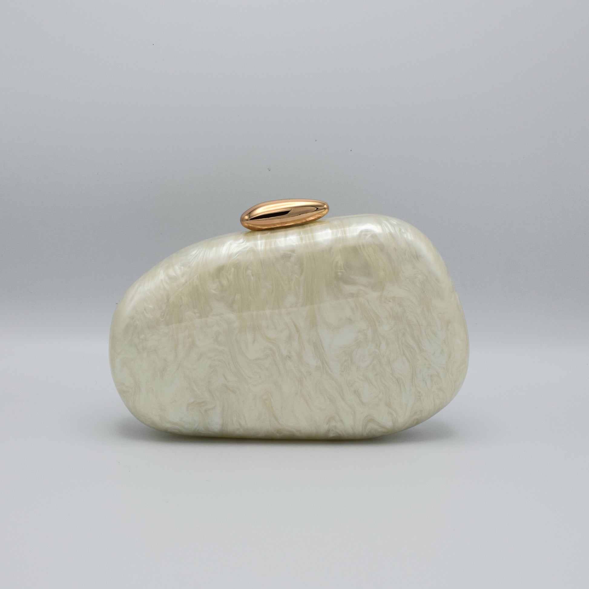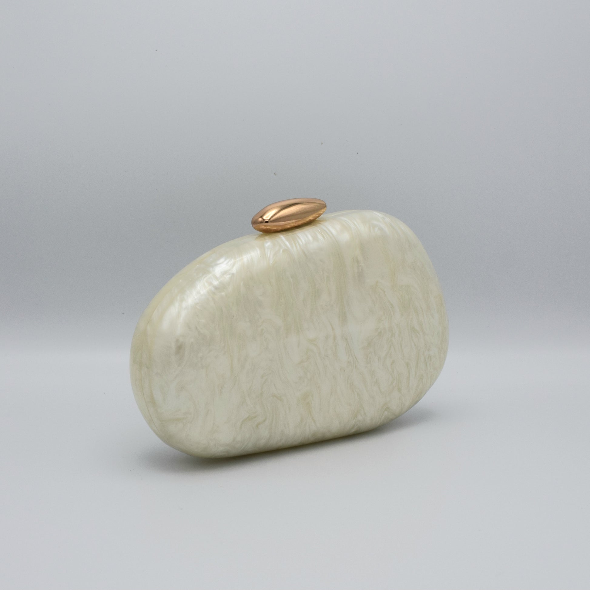 Puissance is power, sculpted in pearl. With its smooth, curved silhouette and luminous white acrylic finish, this clutch radiates confidence and calm. The polished gold-tone clasp adds a refined touch, making it the perfect piece for weddings, formal dinners, or moments where elegance must speak for itself. Bold in form yet soft in spirit, Puissance is for the woman who leads with presence.
