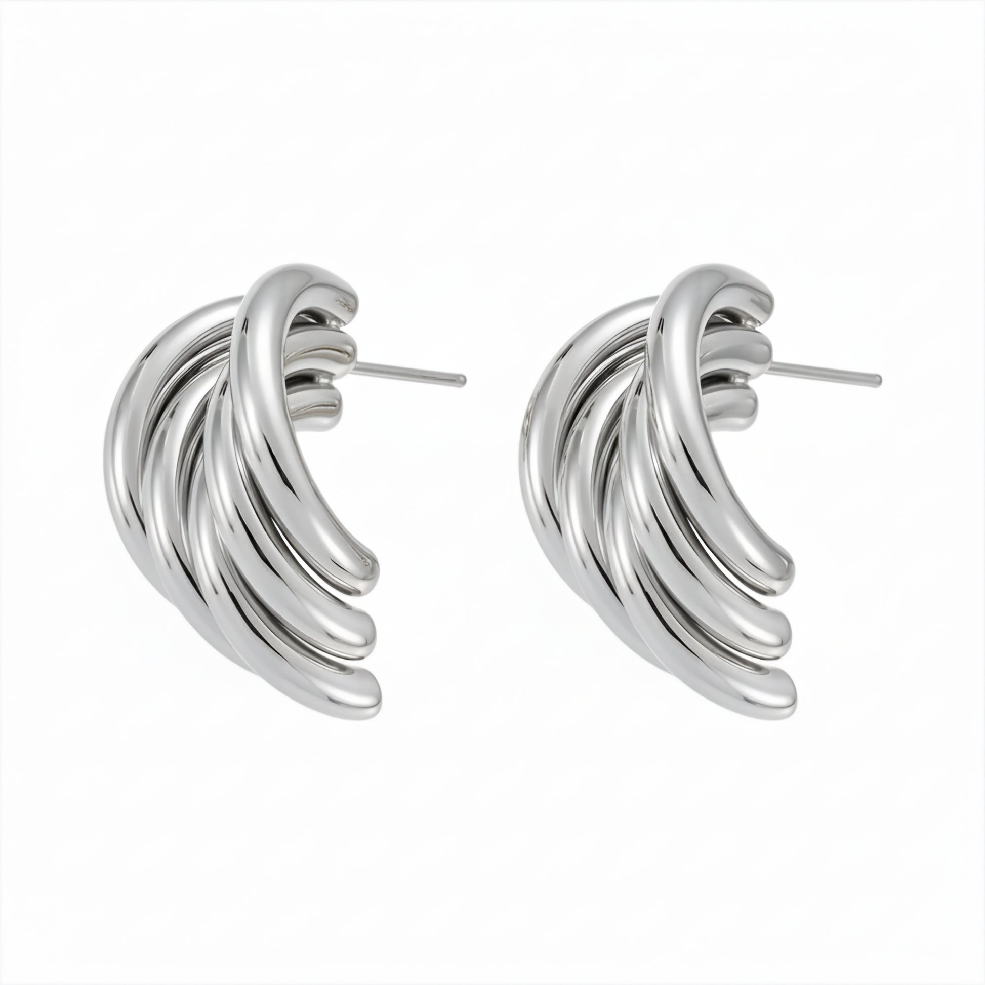 Introducing our Ripple Fan Earrings a refined sculptural piece inspired by movement, flow, and modern elegance. Crafted from high quality stainless steel and finished in radiant 18K gold or polished silver, these earrings feature layered curved bands that form a graceful fan like silhouette, adding depth and shine to every look.