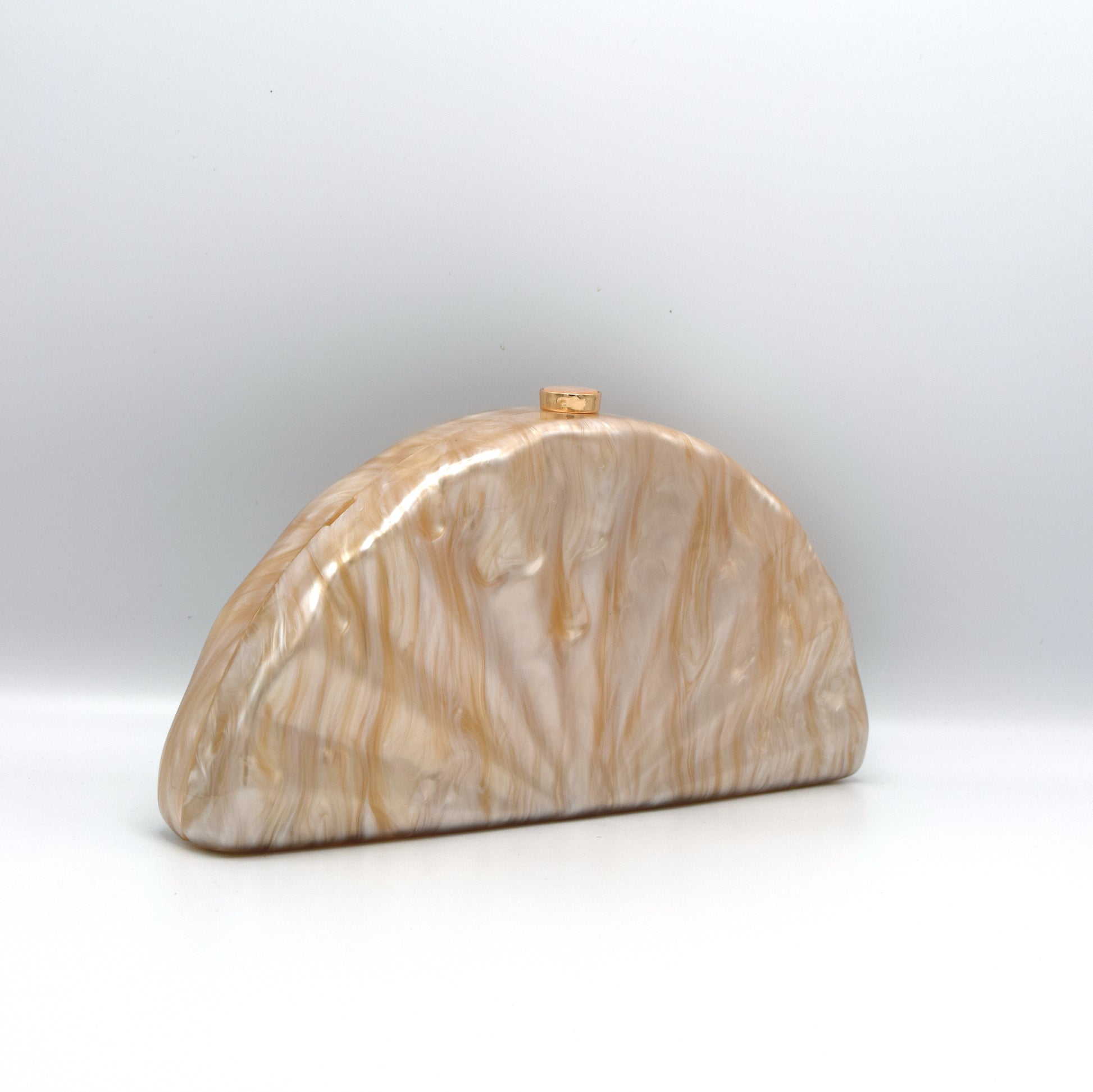 A stunning accessory designed in a unique semi-circle hand fan shape that adds elegance and flair to any outfit. Crafted from high-quality acrylic, the Sensu Clutch comes in four striking color options: Champagne, Beige, Fuchsia, and Emerald Green. The clutch features a secure metal clasp for closure and includes a detachable metal chain, offering the flexibility to carry it as a handheld piece, shoulder bag, or crossbody accessory.