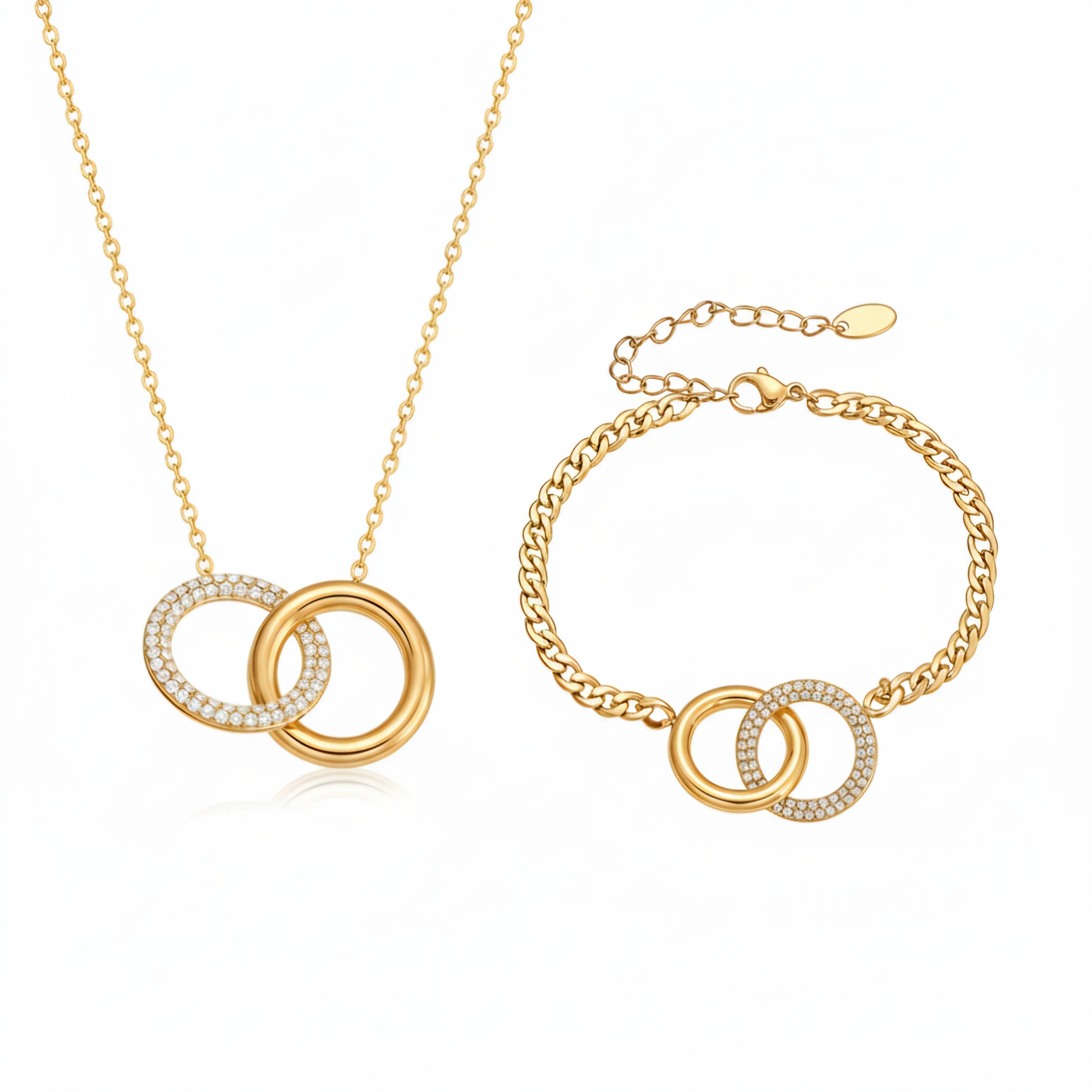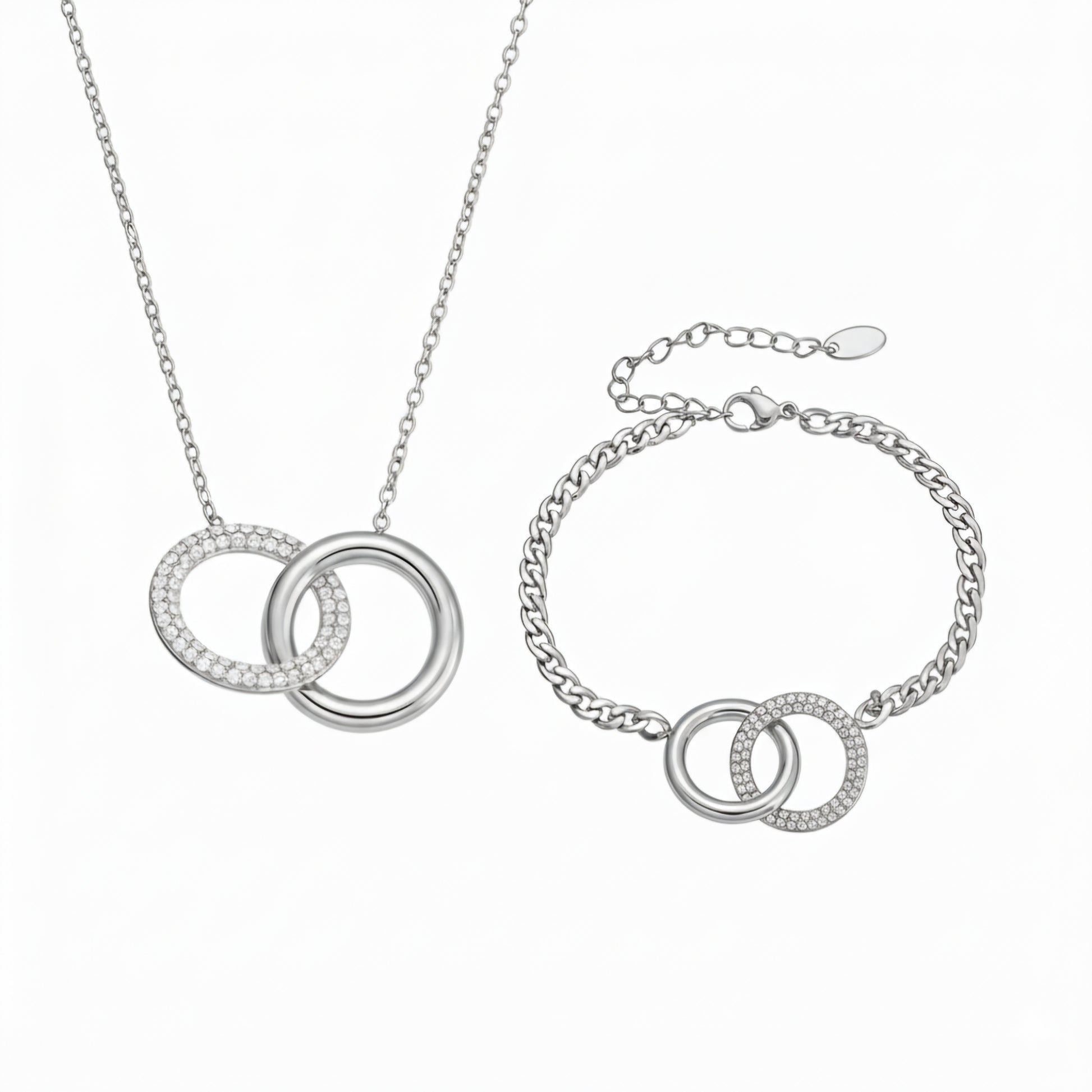 Introducing our Soulmate Circles Set a timeless pairing crafted to celebrate connection and enduring elegance. Designed in high quality stainless steel, both the necklace and the bracelet feature two interlocking circles symbolizing unity, harmony, and everlasting bonds.
